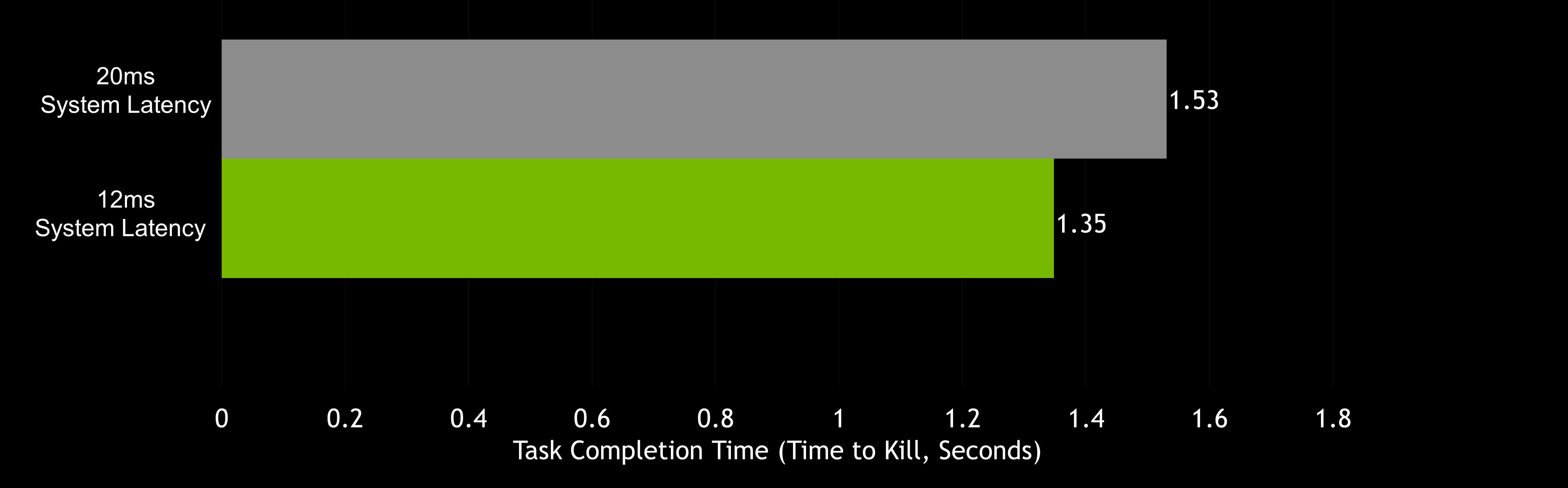 NVIDIA 研究发现,即便是微小的系统延迟差异(12 毫秒与 20 毫秒)也会给瞄准表现造成极大的影响。实际上,在一台系统延迟介于 12 毫秒到 20 毫秒之间的 PC 上,完成瞄准任务的平均差异(找到目标并击中目标所需的时间)为 182 毫秒 – 大约是系统延迟差异的 22 倍。为了说明这一点,在相同的目标难度下,使用 12 毫秒 PC 设置时,在 128 tick(每秒对弹道的判定次数)的 VALORANT 或 CS:GO 服务器中,您的射击平均会提前 23 tick 被判定为命中目标。然而,大多数游戏玩家使用的游戏系统延迟高达 50-100 毫秒!
