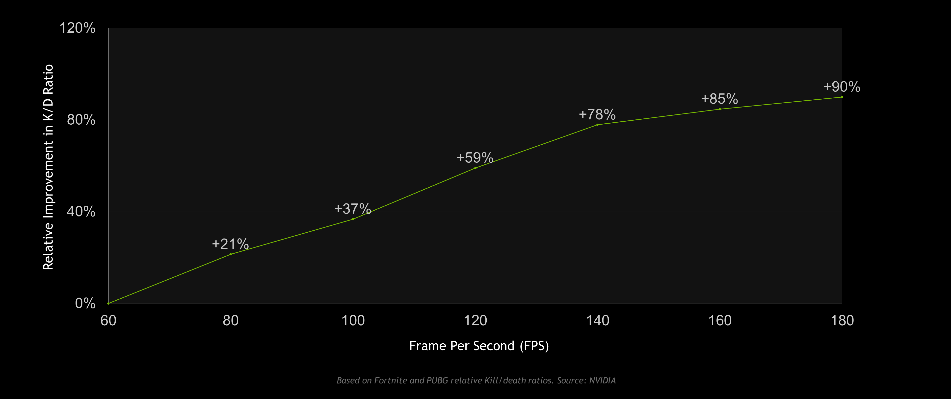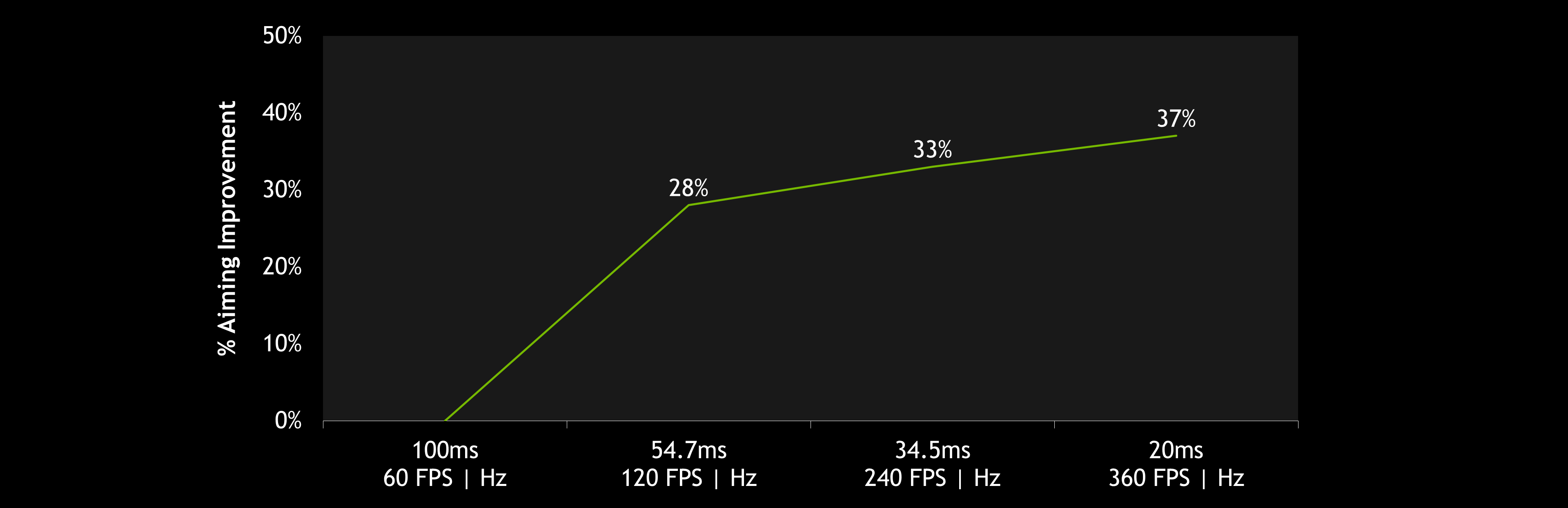 在竞技游戏中,较高的 FPS 和刷新率 (Hz) 能降低延迟,提高您的输入操作如愿体现在屏幕上的几率。延迟的减少幅度即便很小,也会影响甩枪表现。在我们的最新电竞研究博客中,NVIDIA 研究团队探索了不同级别的系统延迟对玩家表现有怎样的影响。