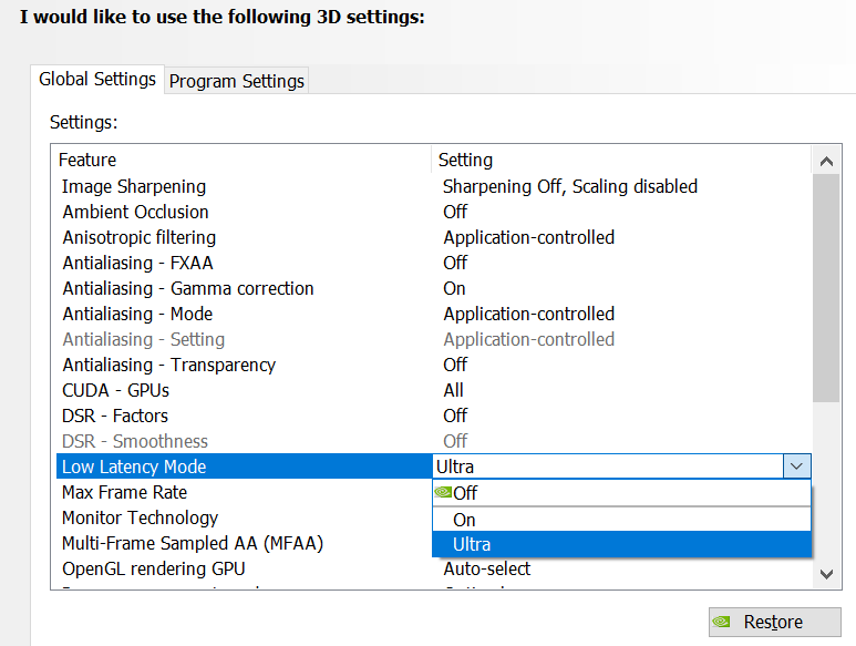 如果游戏不支持 Reflex SDK,玩家仍可以通过从 NVIDIA 控制面板启用 NVIDIA 超低延迟模式来获得一定的延迟改善。只需打开控制面板并导航到“Manage 3D Settings”(管理 3D 设置),然后依次选择“Low Latency Mode”(低延迟模式)、“Ultra(超)”选项即可。如前文所述,这将有助于降低渲染延迟,但不能完全控制管线。
