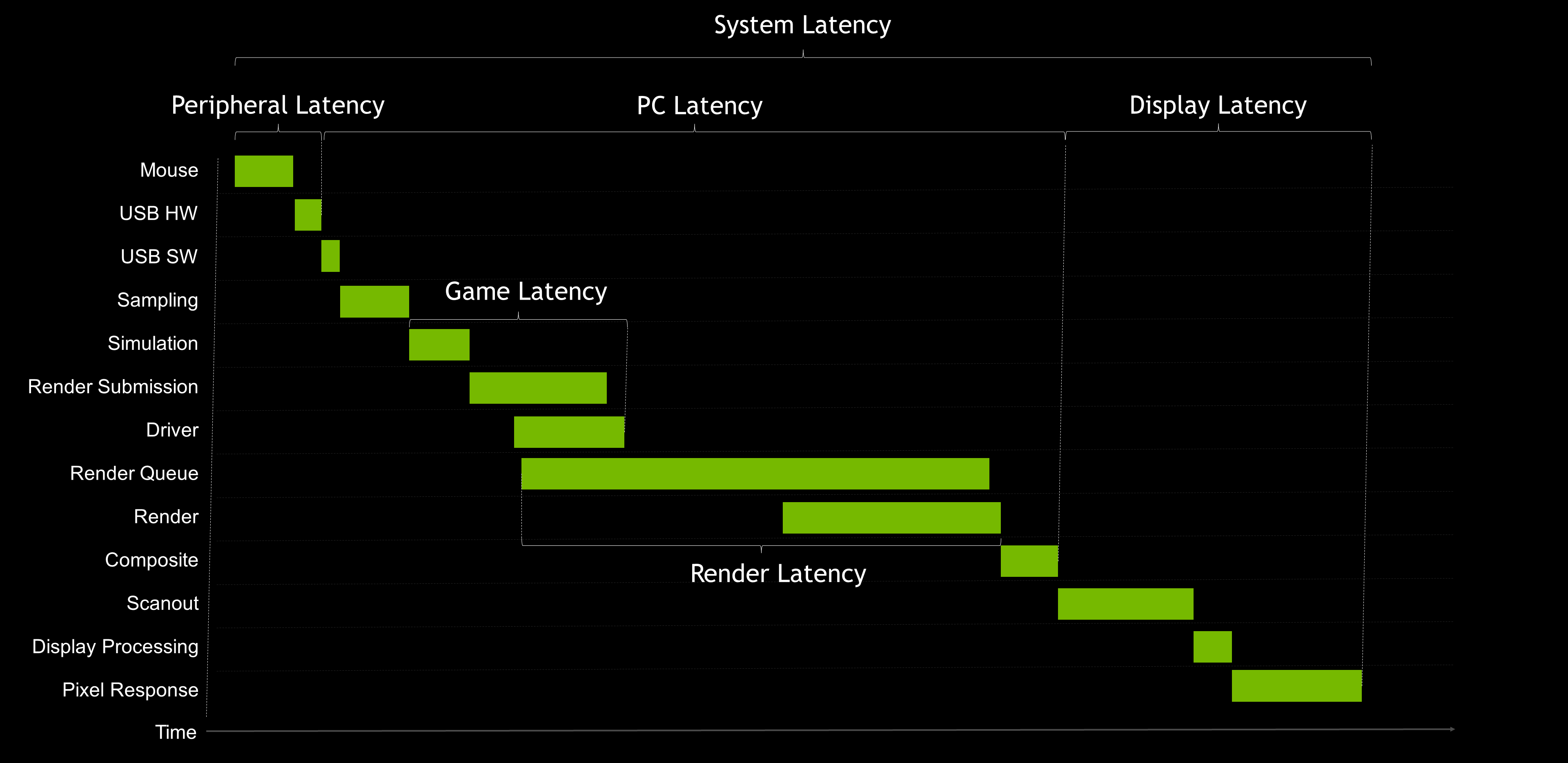 那么,鼠标点击操作实际上如何传递到显示器?下图分解了管线的各个阶段。请注意,虽然这些阶段之间存在重叠,但它们一定要按照从左到右的顺序开始和完成。