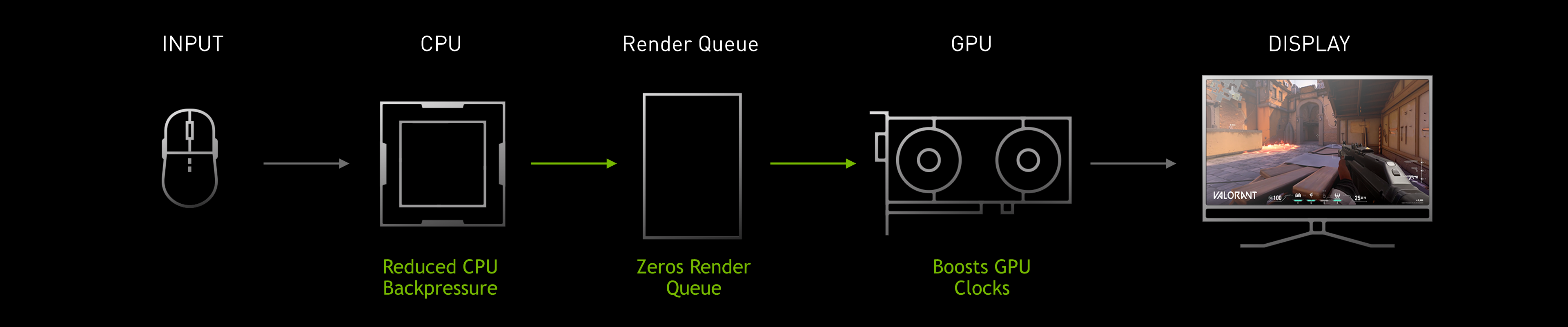 使用 Reflex SDK,游戏开发者可以实现低延迟模式,在这种模式下,游戏引擎能够完成即时渲染,从而消除 GPU 渲染排队现象,减轻受 GPU 限制的情况下造成的 CPU 反压。